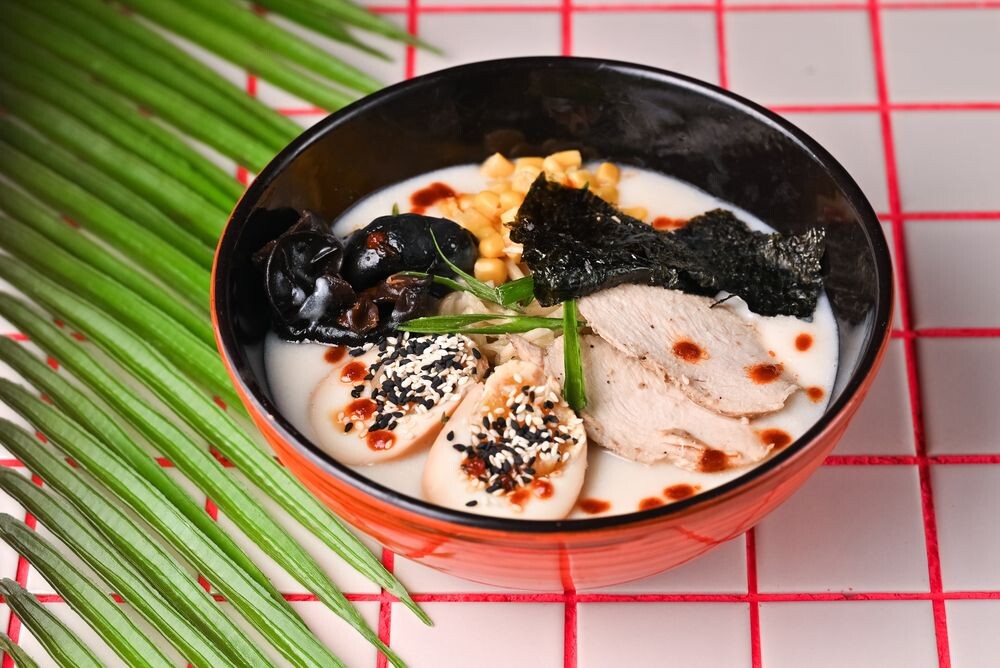Пшеничная лапша в сливочно-говяжьем бульоне с куриной грудкой, грибами муэр, кукурузой, яйцом аджитама, соевой пастой, зеленью и нори.