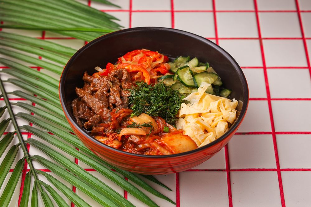 Корейский суп с говядиной,лапшой, омлетом, кимчи, огурцами и болгарским перцем.