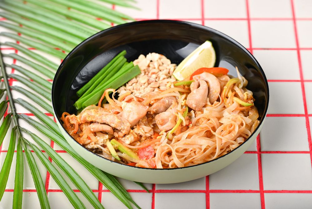 Классическое блюдо тайской кухни из обжаренной рисовой лапши с овощами и куриным филе в яйце с соусом пад тай. Подается с кусочком лайма, зеленым луком и обжаренным арахисом.