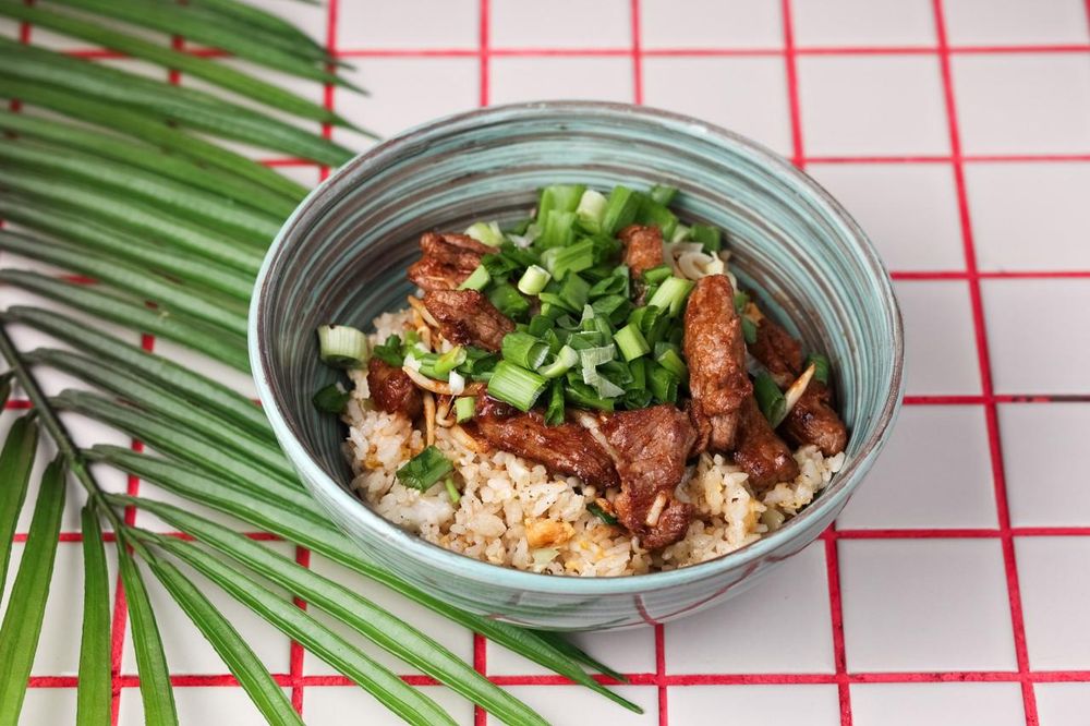 Обжаренный рис с говядиной, ростками сои,луком и яйцом в соусе чили.