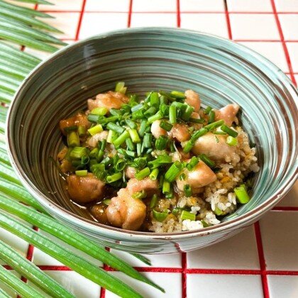 Обжаренный рис с морским гребешком, яйцом, луком в устричном соусе. Посыпан кунжутом