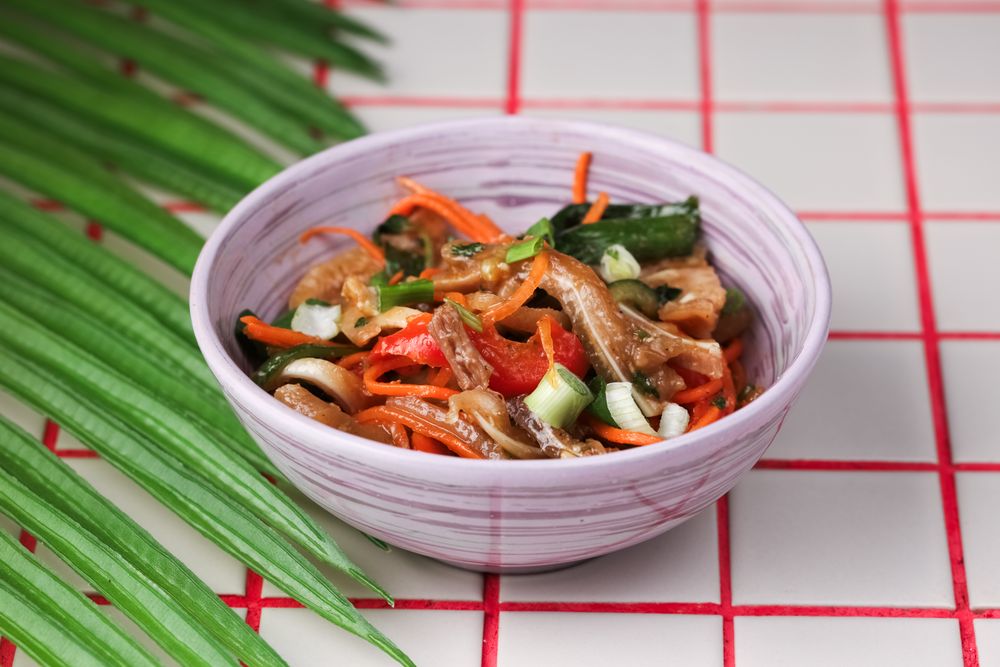 Свиные уши, огурец, перец болгарский, морковь, лук зеленый, кинза, масло кунжутное, соевый соус.