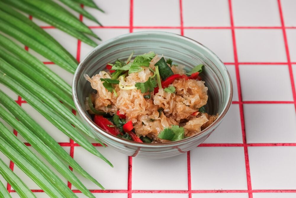 Коралловый гриб, огурцы, перец болгарский, лук зеленый, кинза, соевый соус , специи.