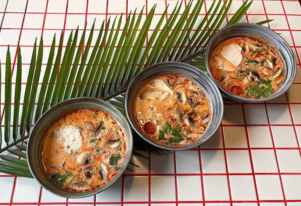 Три Том Яма с бархатистым вкусом. Сочные кусочки курицы и ароматные грибы деликатно дополняют друг друга. Остроту смягчает кокосовое молоко, а свежая кинза добавляет яркости и пикантности