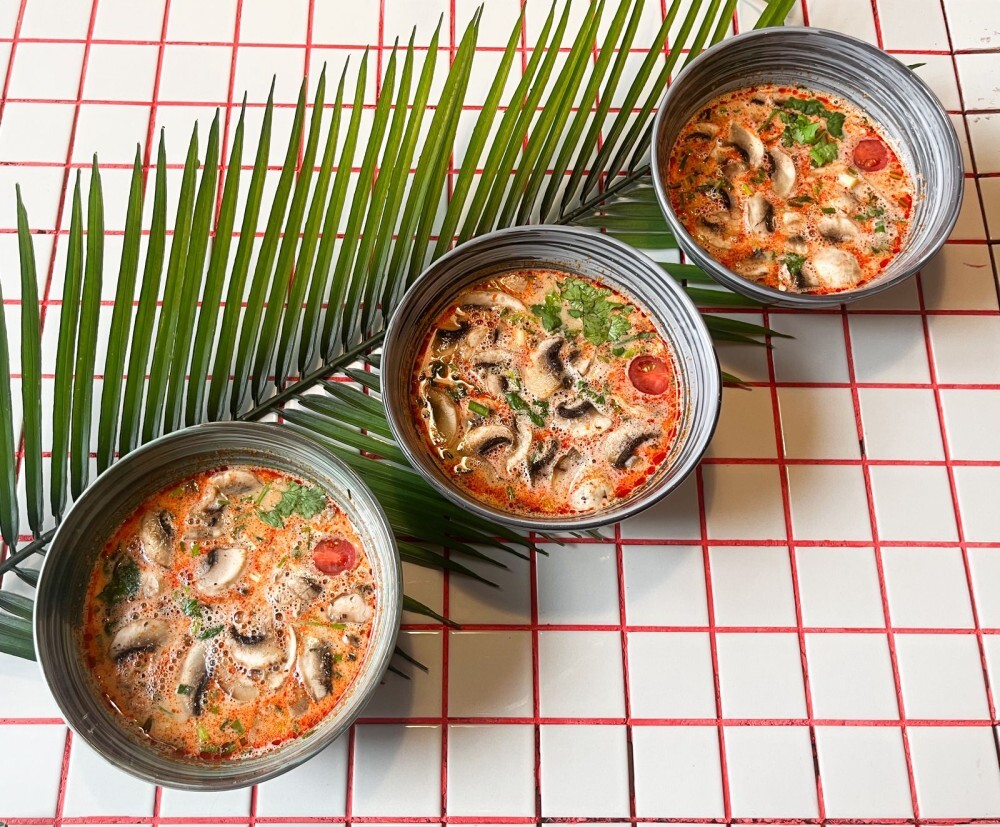 Три Том Яма , где нежный кокосовый бульон словно шепчет о тропических берегах. Сочные креветки, деликатные кусочки кальмара ,грибов . Остроту смягчает капелька кокосового молока, а свежая кинза добавляет яркости и пикантности.