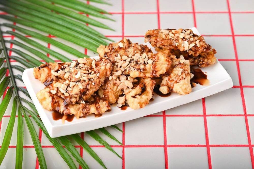 Бананы в кляре, жаренные во фритюре. Подаются с топпингом и арахисом