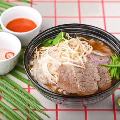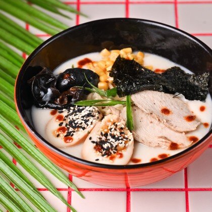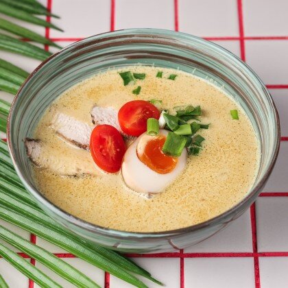 Пшеничная лапша в сырном бульоне на основе молока, сыра и говядины с куриной грудкой, зеленью, шампиньонами и ростками сои.