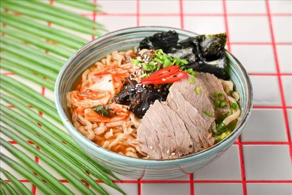 Острый бульон из говядины, пшеничная лапша, капуста, кимчи, древесные грибы, говядина, зеленый лук, нори, перец чили.