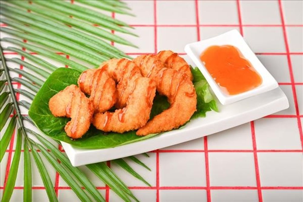 Креветки в панировке, жареные во фритюре. Подаются с соусом
