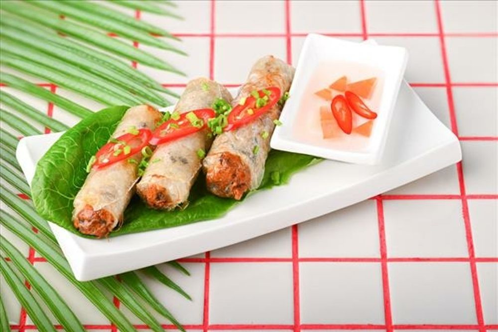 Вьетнамские рулетики из рисовой бумаги с начинкой из мяса, грибов, овощей и фунчозы. Подаются с пряным соусом