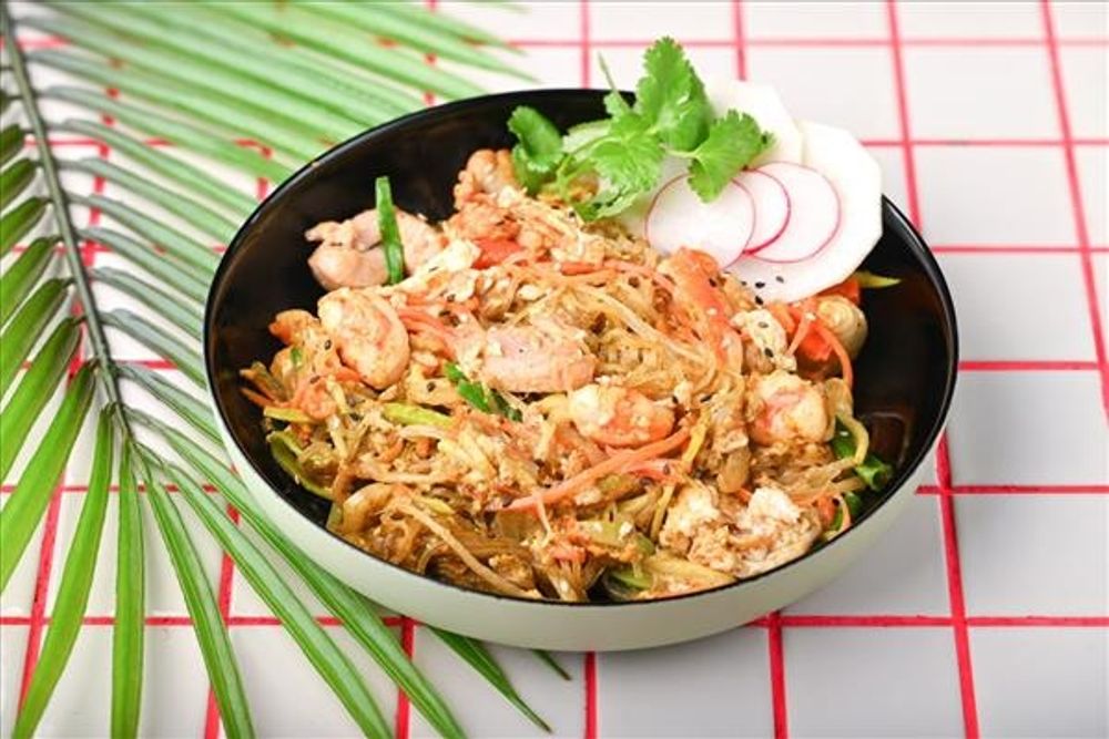 Обжаренная фунчоза с тигровыми креветками, куриным филе, яйцом и овощами, заправленными сладким соусом карри