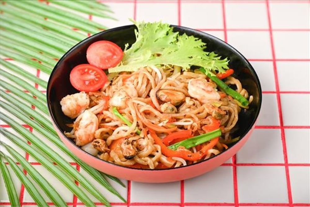 Пшеничная лапша в устричном соусе с ростками сои, имбирем, овощами, креветками, мидиями и кальмарами.