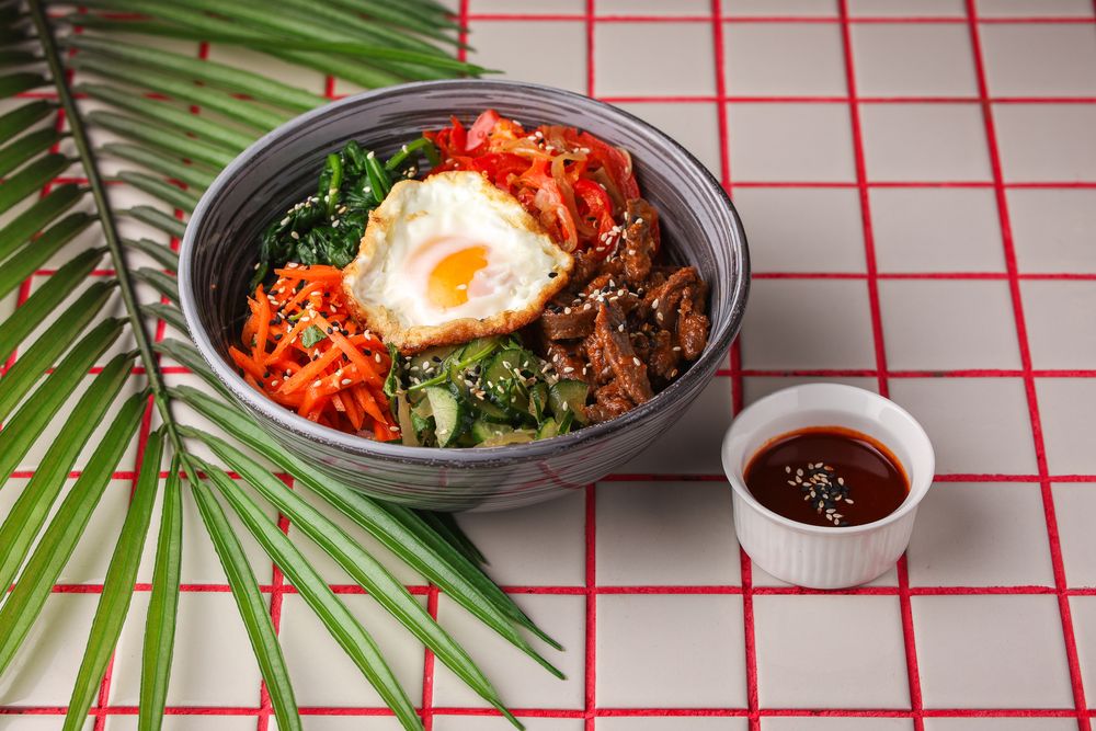 Рис с обжаренной говядиной, маринованным шпинатом, огурцами, болгарским перцем, морковью, яйцом. Заправлен кунжутным маслом и острым соусом.