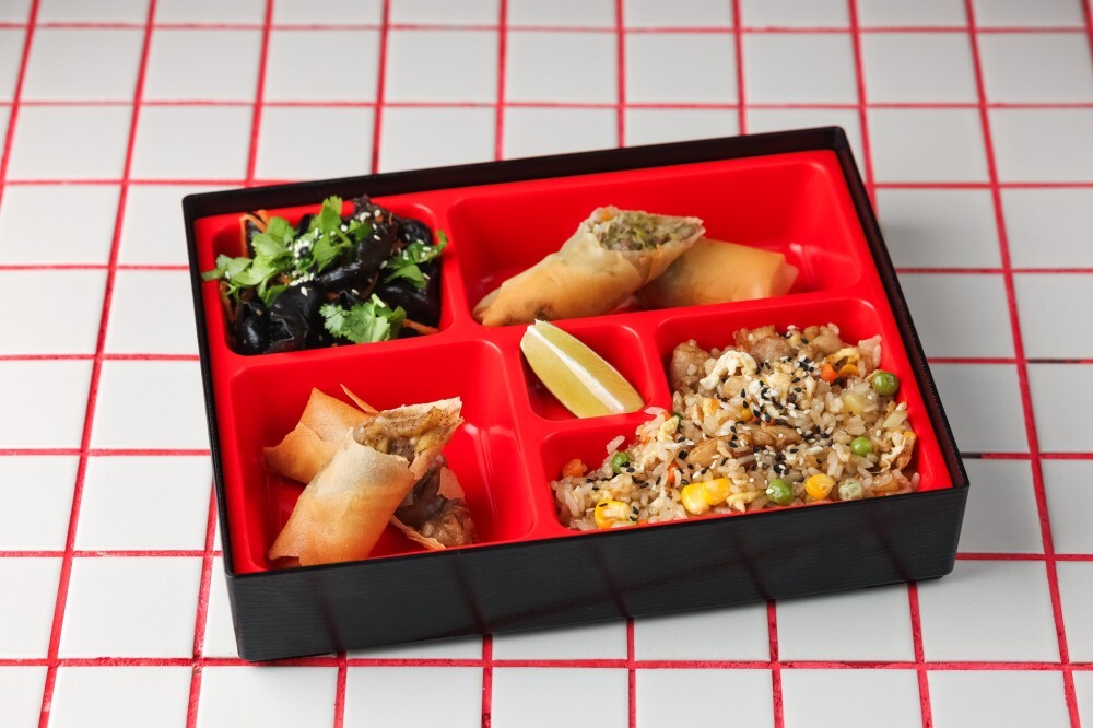 Жареный рис с курицей по-тайски , спрингролл , спрингролл штрудель , салат древесные грибы .
