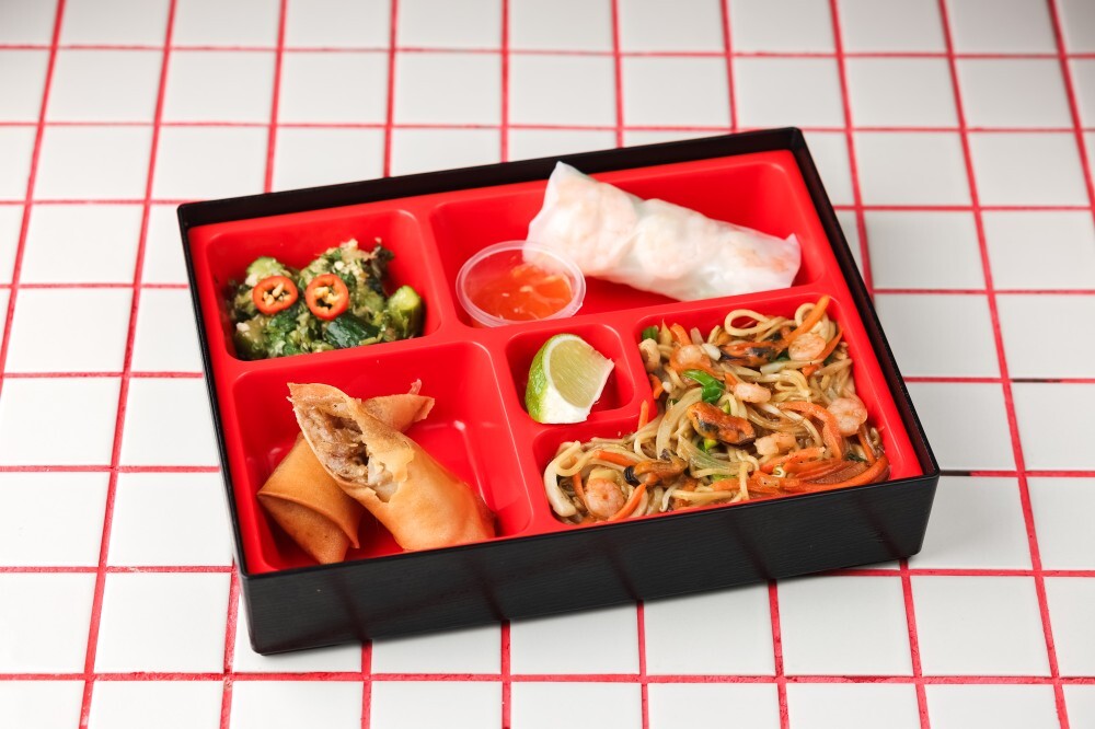 Фучжоу лапша с морепродуктами , гой куон , салат битые огурцы , спрингролл штрудель .