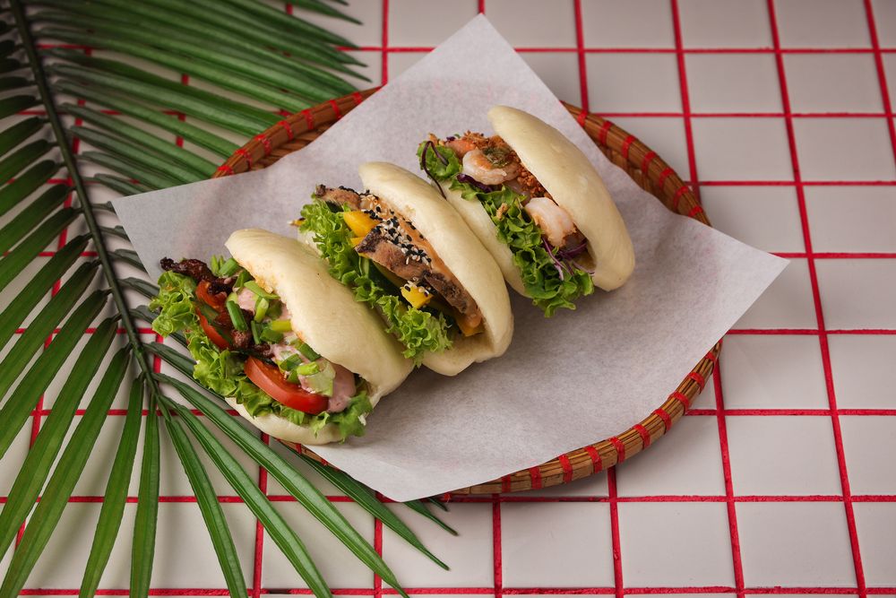 Гуа-бао с курицей, гуа-бао с говядиной и гуа-бао с креветками.