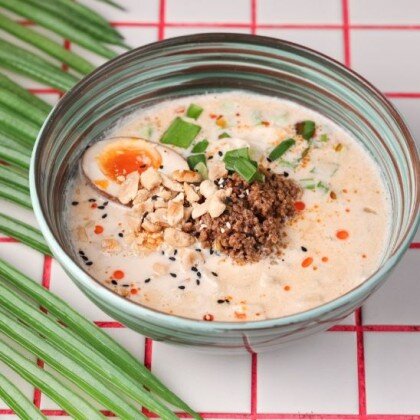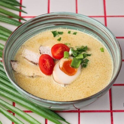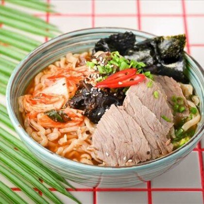 Бульон говяжий, рисовая лапша, лук красный, ростки сои, кинза, перец чили, лук зеленый, лайм, говядина