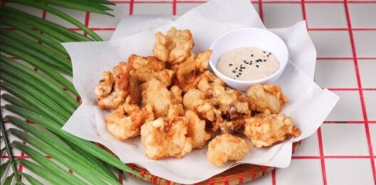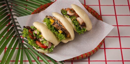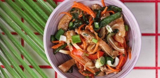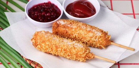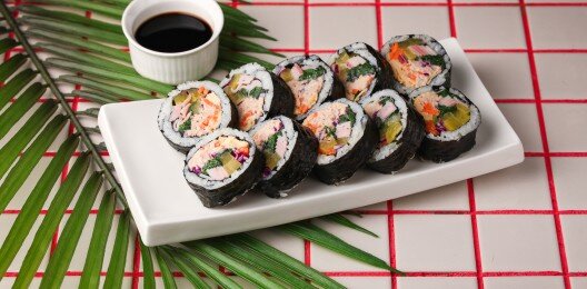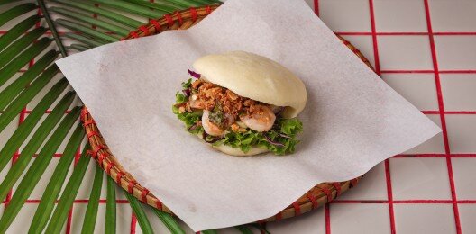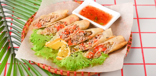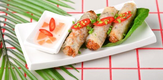 Ролл с креветками, овощами, манго и фунчозой, завёрнутыми в рисовую бумагу. Яркий вкус придаёт соус манго чили.