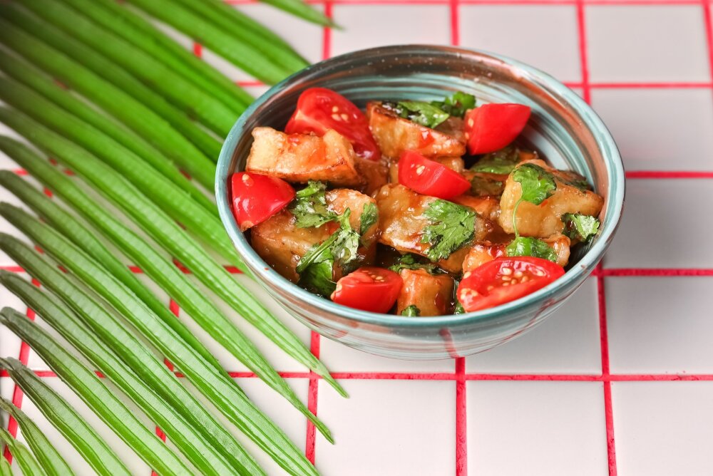 Тёплый салат из жаренных в крахмале баклажанов с соусом свит чили и зеленью.