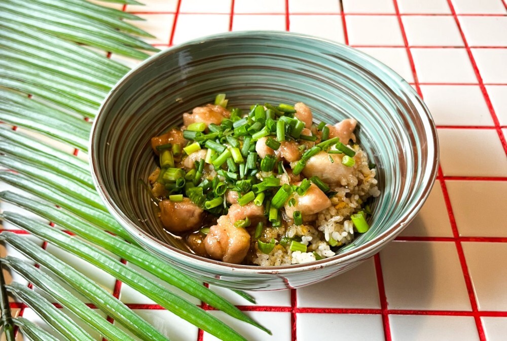 Обжаренный рис с кусочками курицы в соусе терияки, яйцом и луком порей .