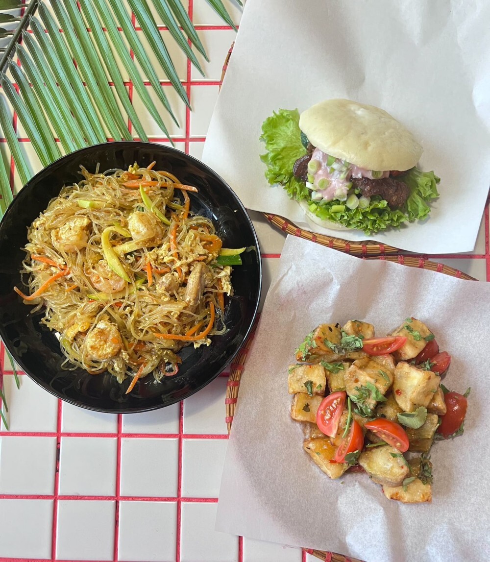 Обжаренная фунчоза с тигровыми креветками, куриным филе, яйцом и овощами, заправленными сладким соусом карри.