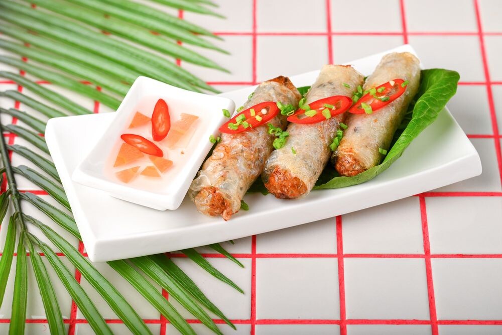 Вьетнамские рулетики из рисовой бумаги с начинкой из мяса, грибов, овощей и фунчозы. Подаются с пряным соусом.
